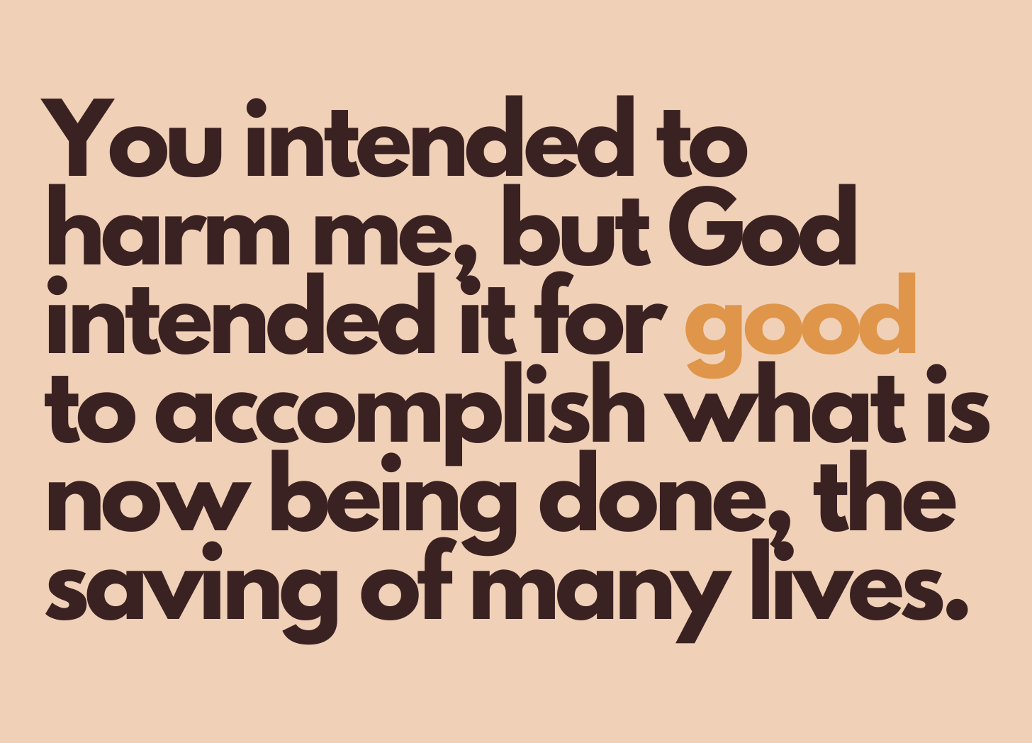 In this story of Joseph, we get a glimpse of the Gospel of Jesus. In the last chapter, Joseph says, “you intended to harm me, but God intended it for good to accomplish what is now being done, the saving of many lives.” (Gen. 50:20). Through the obedience of one man, many were saved. Joseph submitted to God’s ways. Jesus is the whole fulfillment of that picture, perfect submission to the ways of God to trust His goodness beyond our own idea of goodness. Jesus, who many intended to harm, submitted Himself to God who intended Jesus’ death for what is being done right now, the saving of many lives.